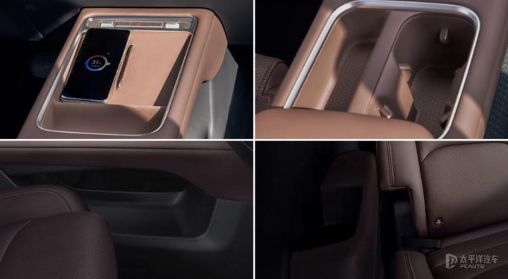 此外,全车设有25处人性化储物空间,包括贯穿式储物盒、前中后排杯托、前排地图袋、后排储物盒、左右衣帽钩,还配备支持50W无线快充的专属手机台。